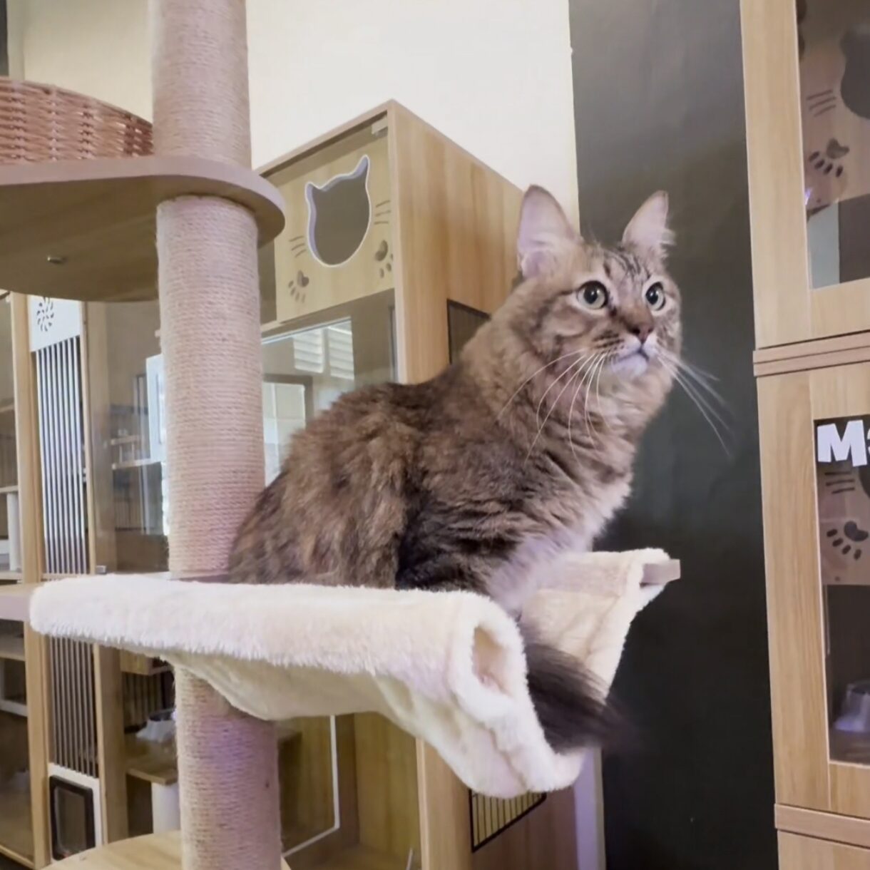 For our Meow, we have fully enclosed indoor playground with multi-level cat towers and cat wheels where freedom to move meets comfort.
